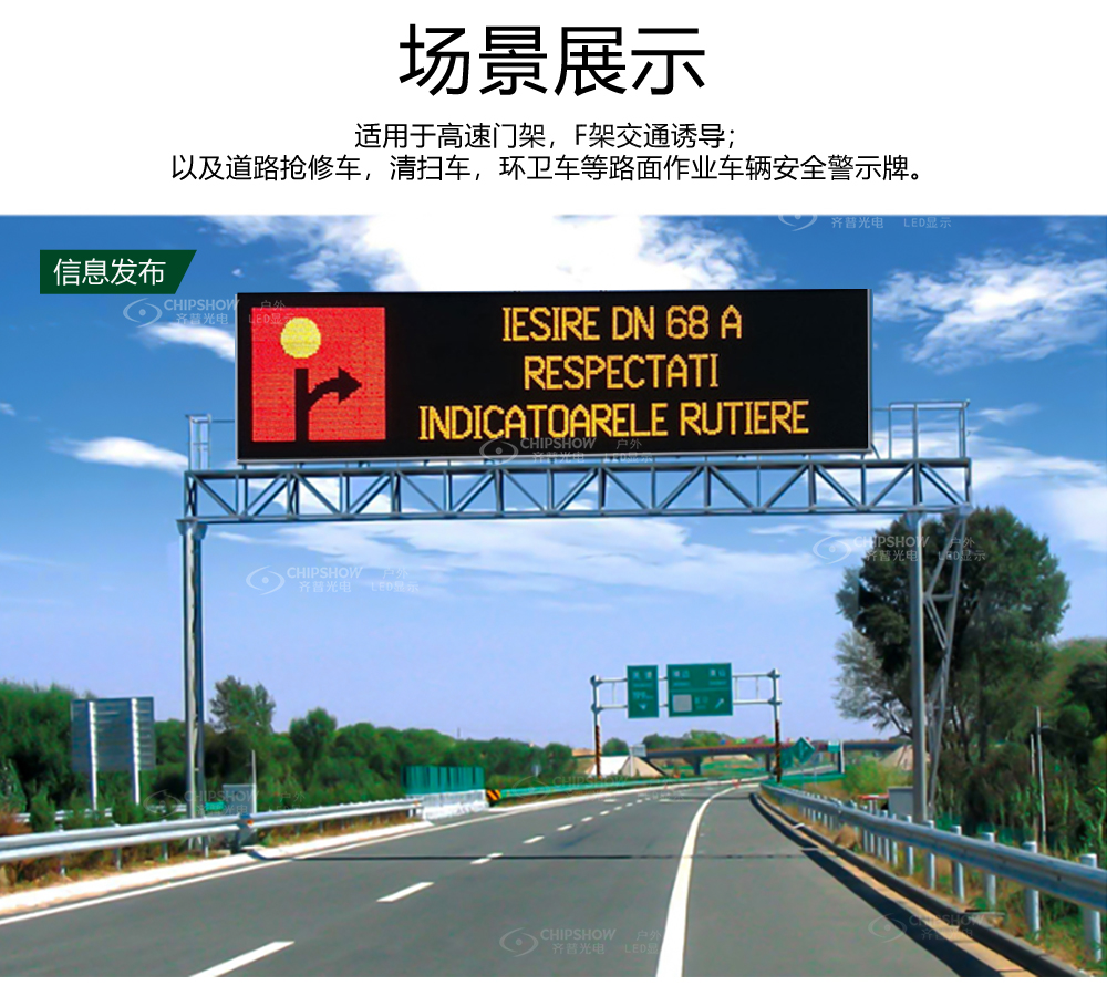 门架式可变信息标志是高速公路交通诱导信息发布的重要设备,能够有效 地对交通流量进行诱导,提高路网的交通运输能力,为驾驶人员安全快速 行车提供优质服务。产品符合<<LED道路交通诱导可变信息标志GA/T 484-2018>>中的设计标准。