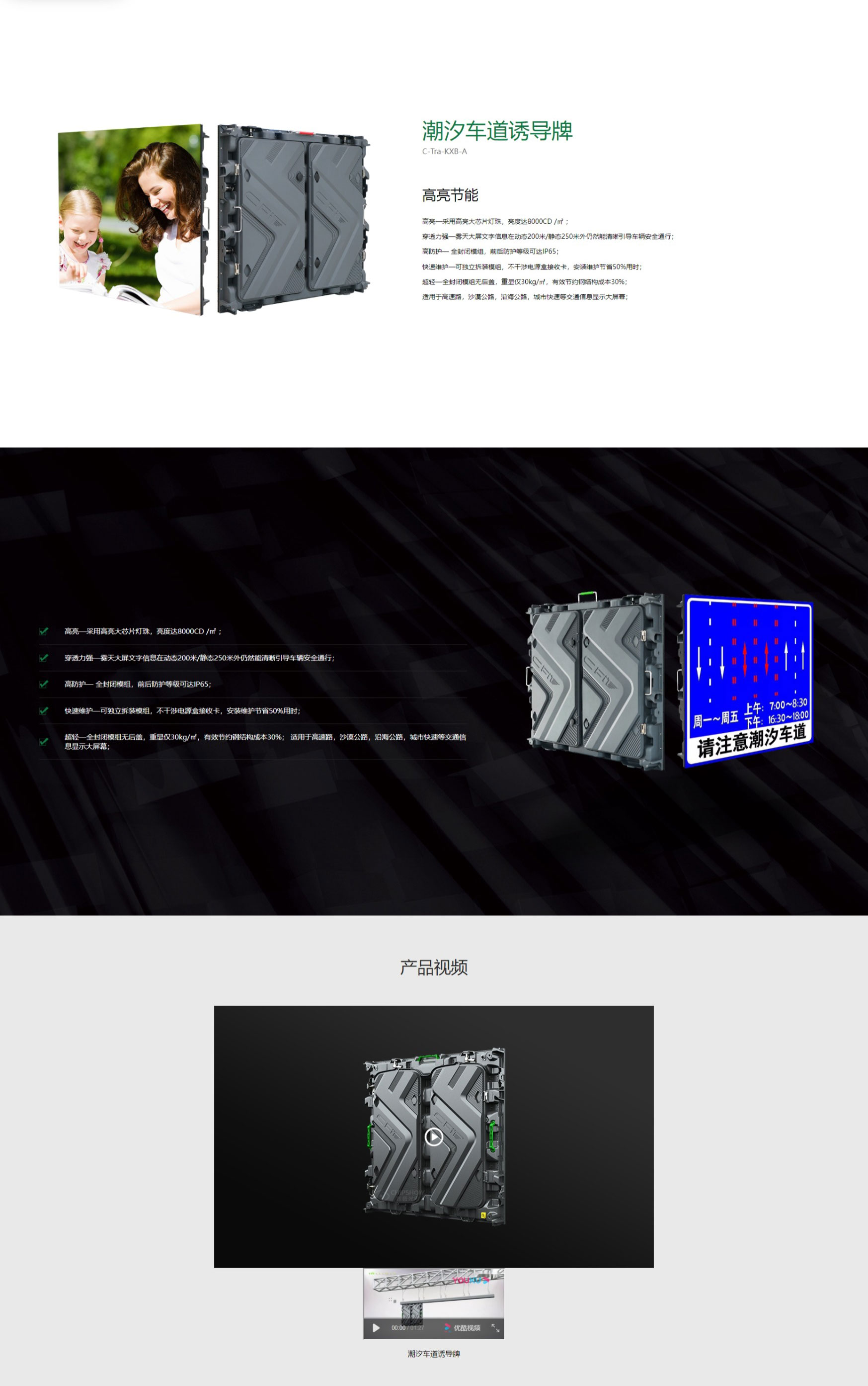 支持国际标准的NTCIP通信协议;支持异步系统控制,可显示视频文件。 采用高可靠性工业级控制主板及电源,复杂天气24小时连续不间断工作。 LED发光器件采用国际进口光源,光学性能的同时使用寿命10年以上。