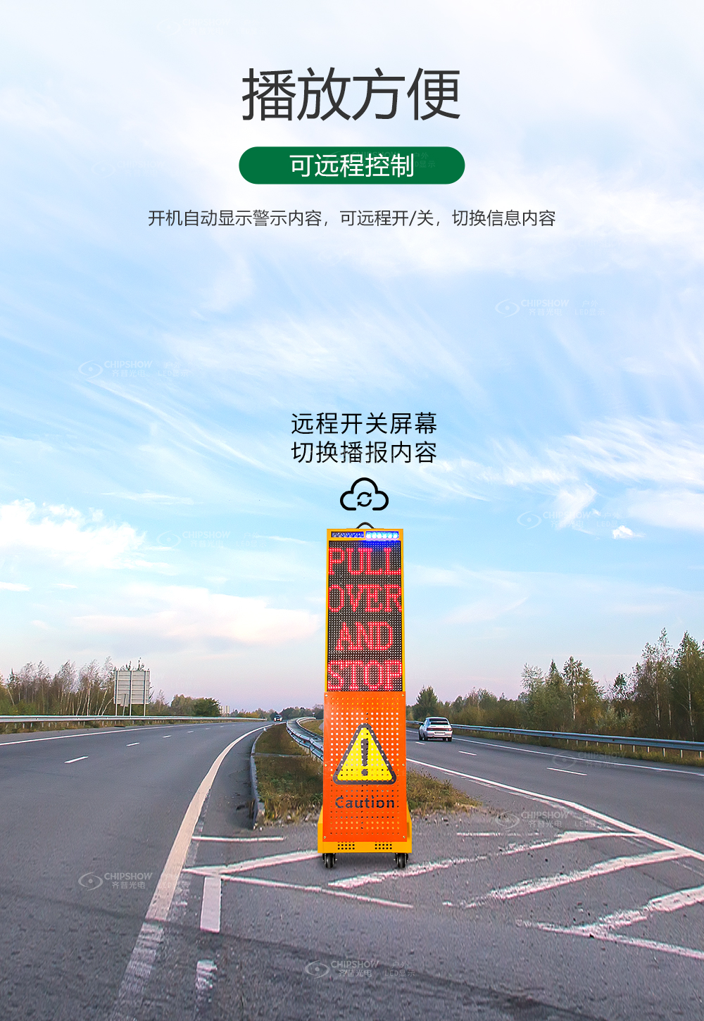 5. 播放方便- 开机自动显示警示内容,可远程开/关,切换信息内容;