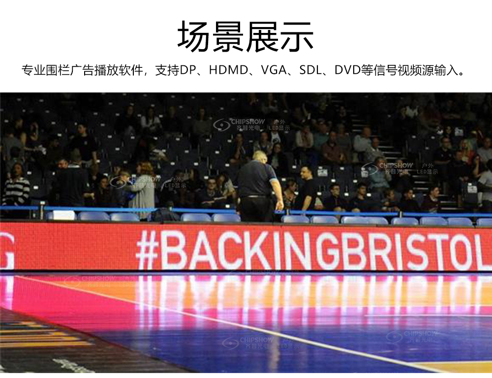 7. 专业围栏广告播放软件,支持DP、HDMD、VGA、SDL、DVD等信号视频源输入。